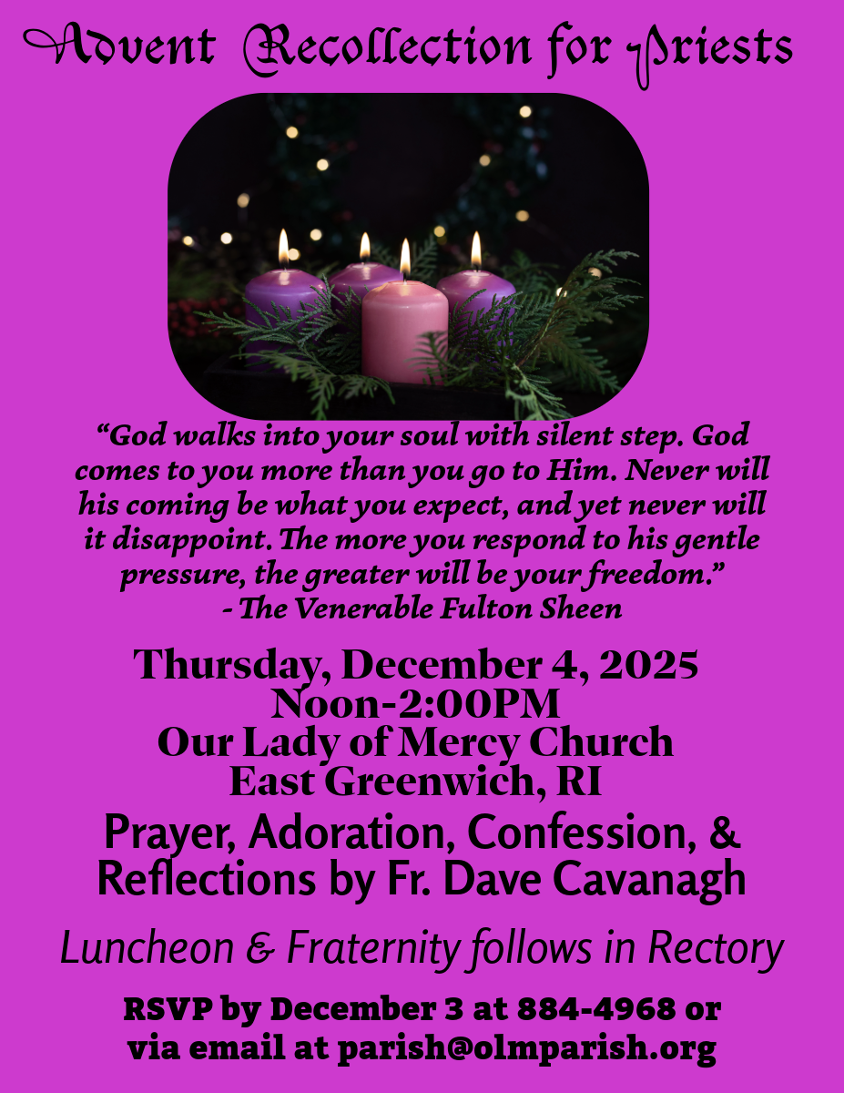 Monthly Priests' Recollection Thursday, December 4, 2025 12:00pm – 1:00pm 12:00 – 13:00 Our Lady of Mercy Catholic Church (map)